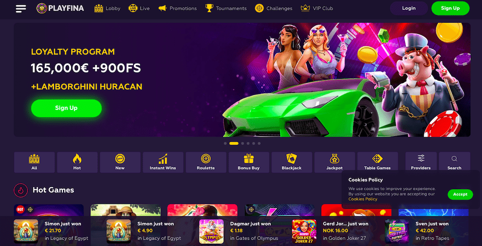 More than 11,000 slots, all varieties of blackjack, dozens of roulette games, craps, video poker, and other games are available to you at Playfina casino online Dive into a Universe of Fun at Playfina Online Casino - Your One-Stop Shop for Gaming Thrills!! Play the Best Online Casino Games at Playfina ✓ Try Slots, Blackjack, Roulette, Craps and Video Poker with Huge Bonuses. Playfina Casino How to Start Up to 1000€ + 200 FS + Secret Bonus... Playfina Casino - Bonus Codes – 50 Free Spins!
